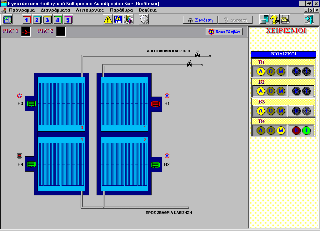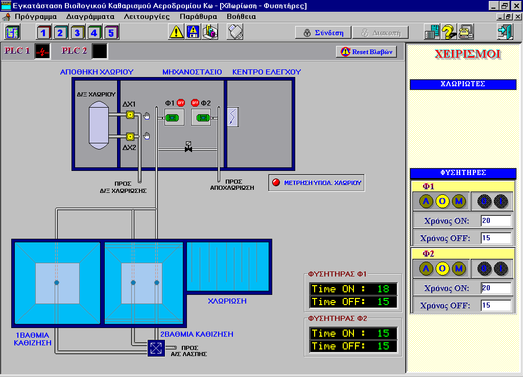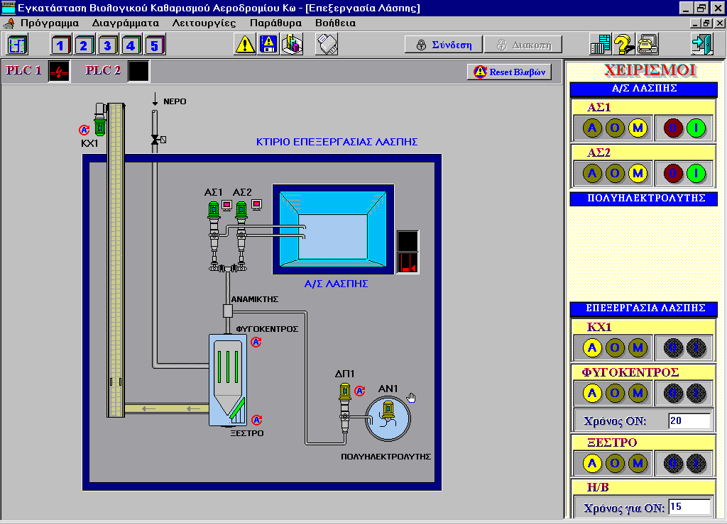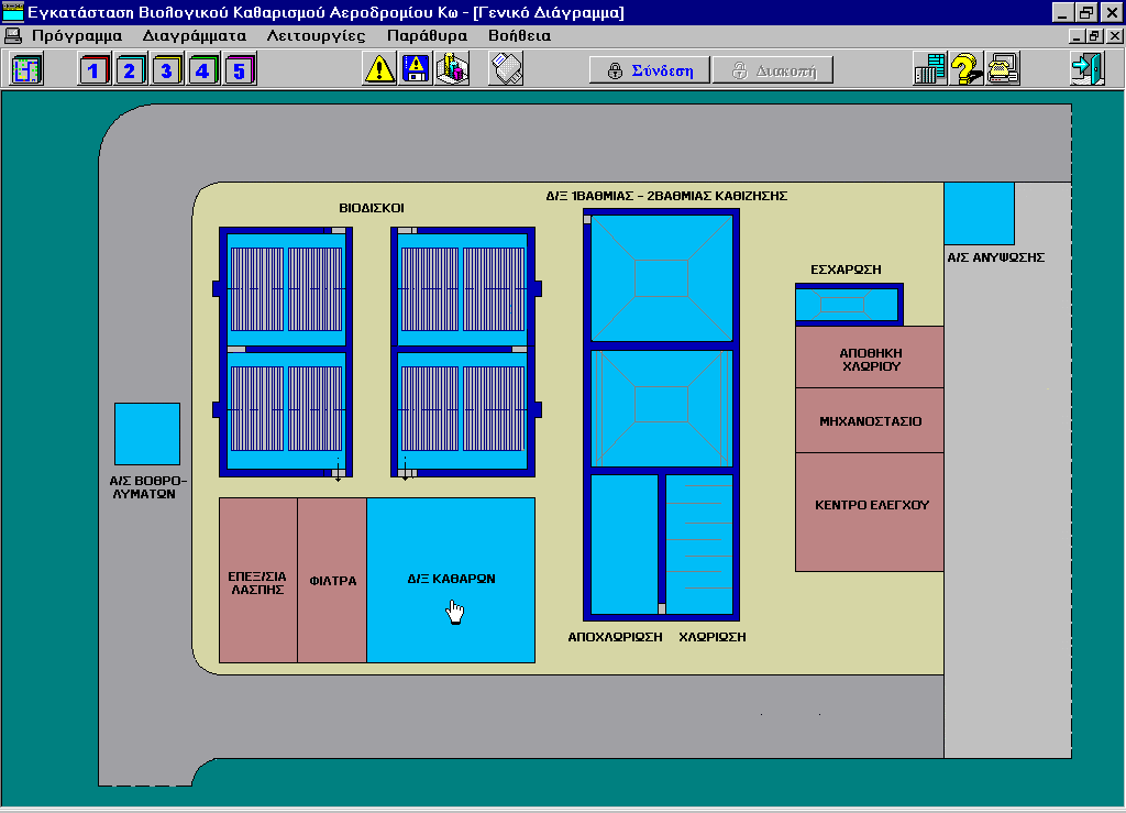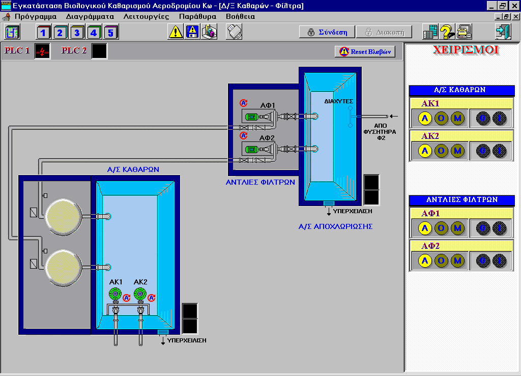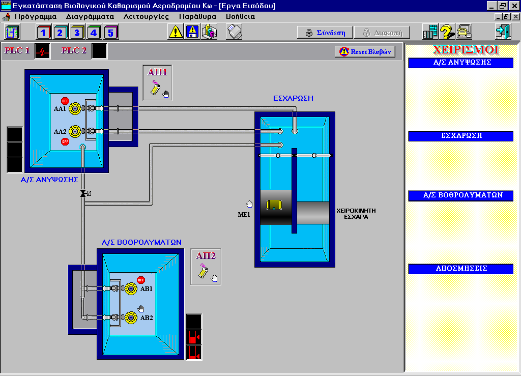 Hellenic Civil Aviation Authority (H.C.A.A.) Kos island airport Monitoring and control system. Operational diagrams of the installation Alarms Management. Actuator commands. Measurements logging. Hour counters for various items. Reporting. .