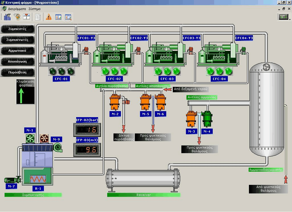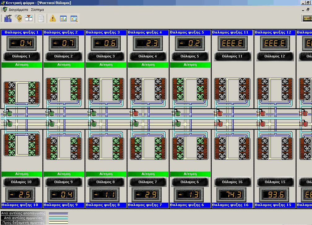 Agricultural Cooperative of Citrus Processing LACONIA. Connection with the control PLC and the compressors' network. Operational diagrams. Alarms management. Storage facilities temperatures logging Compressors hour counting Defrost cycle programming Parameterization of the automation control loops.