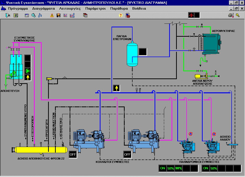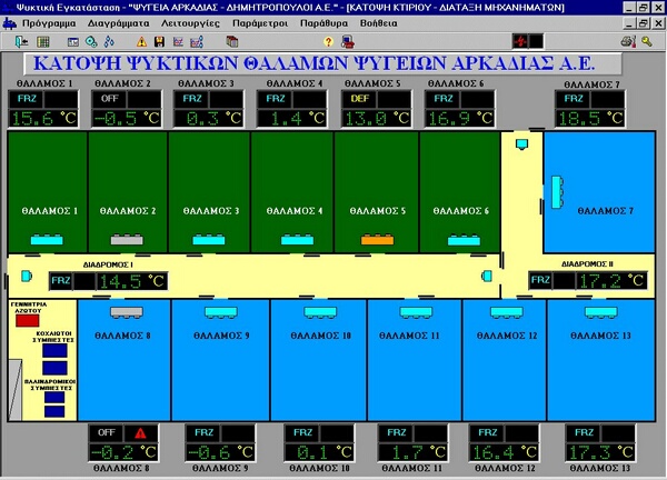 DIMITROPOULOI S.A. Arkafroz Connection with the control PLCs and data acquisition modules. Operational diagrams. Alarms management. Storage facilities temperatures logging Defrost cycle programming Parameterization of the automation control loops. .